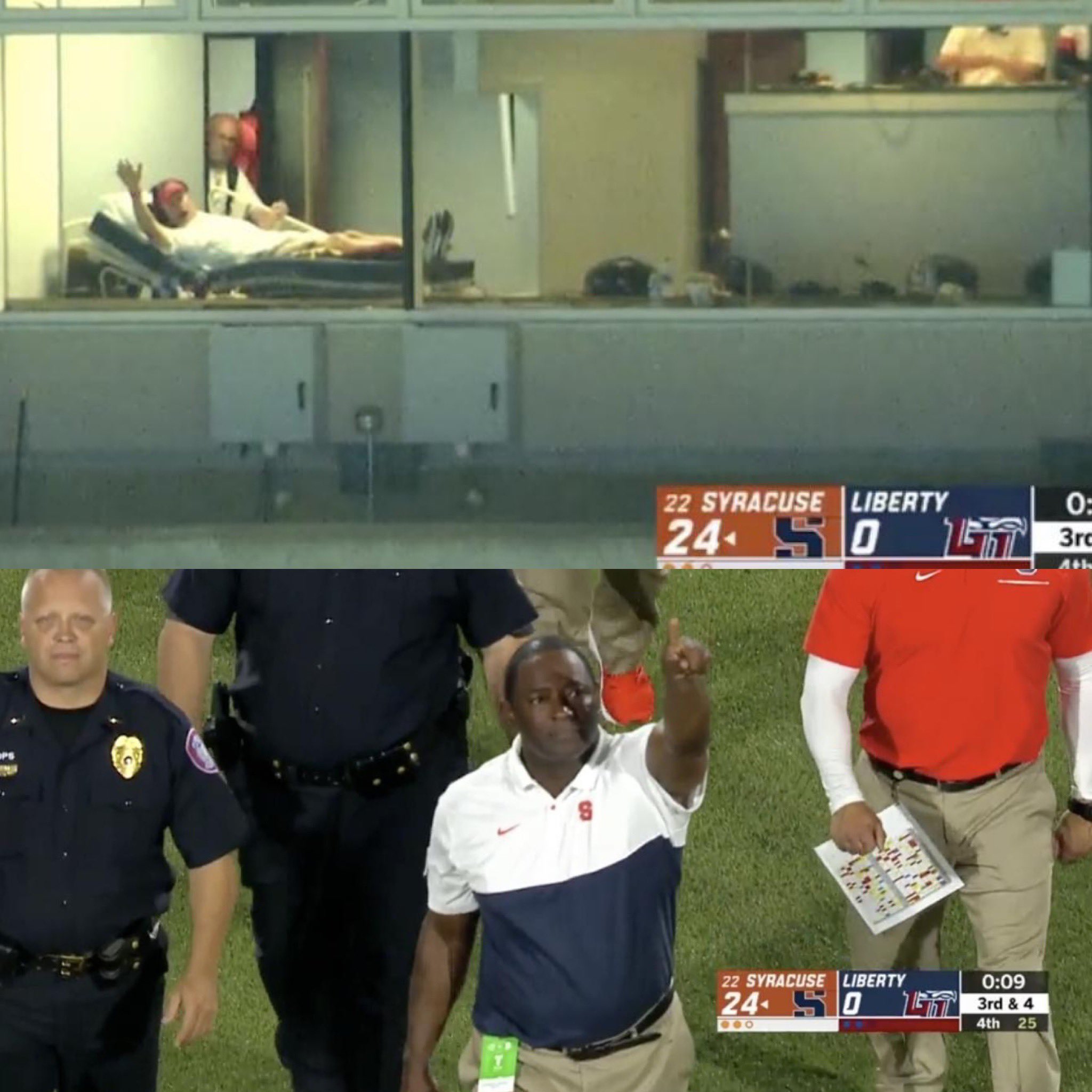 The really bad and incredibly homerific Liberty crew working the ESPN broadcast and then Hugh Freeze showed up to pointlessly coach the game from a hospital bed. How Hugh Freeze treated coaching from a hospital bed like a normal game.